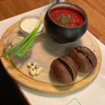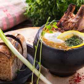 450/100 г • Борщ на насыщенном мясном бульоне с 3-мя видами колбасок. Подаётся со сметаной, чесноком, мини-булочками, подпечёнными с ароматным маслом и фермерским салом